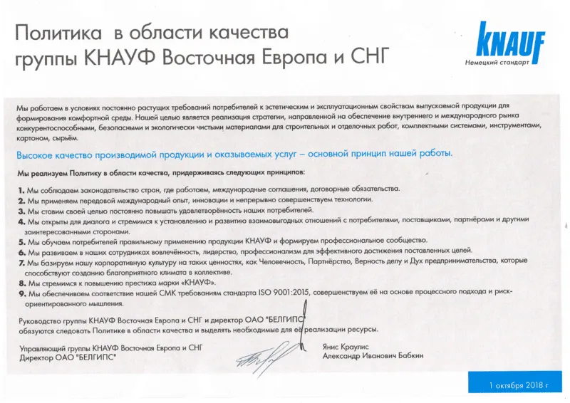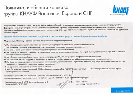 Многие предприятия группы КНАУФ Восток сертифицированы по стандарту ISO 9001 уже более десяти лет, а в настоящее время ведётся подготовка к объединённой сертификации всех предприятий как единого целого. Выгоды для бизнеса при этом — создание прозрачных, оптимальных бизнес-процессов в производстве.