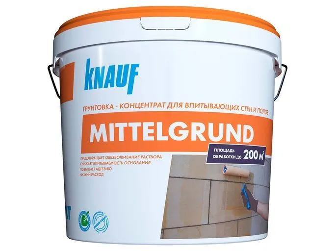 Грунтовка КНАУФ-Миттельгрунд предназначена для обработки поверхностей из газо- и пенобетона, керамического и силикатного кирпича, керамзито- и шлакоблоков, гипсовых и цементных штукатурок, бетонной, цементной и гипсовой стяжки. Эффективно снижает и регулирует впитывающую способность основания, способствует равномерному схватыванию раствора гипсовых и цементных смесей.