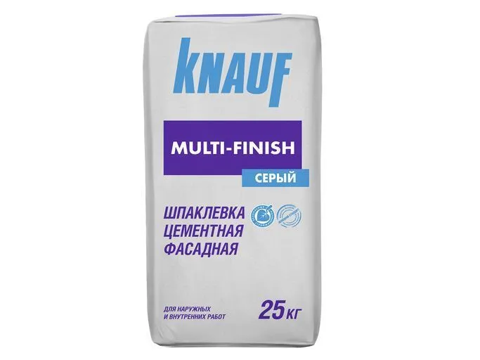 Шпаклёвка КНАУФ Мульти-финиш «серый» - сухая смесь на основе цемента с заполнителем, полимерными добавками, и армирующим волокном. Применяется для наружных и внутренних работ.